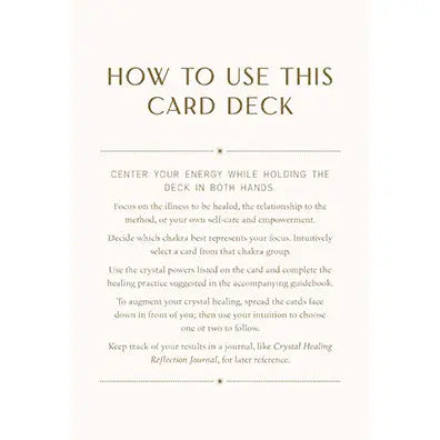 The Crystal Healing Card Deck provides readers with an easy-to-use reference deck for major and minor crystals as well as their physical and emotional healing properties, organized by chakra. This accessible deck makes it easy to get the most out of your crystals and find the best healing practice for you. The card deck includes 64 cards, each one featuring a unique crystal, and a 176-page booklet illustrating the practices that work best with each crystal, all packaged in a beautiful keepsake box. This crystal healing deck is intended for anyone who aspires to deepen their crystal healing journey as they nurture their body, mind, emotions, and spirit.