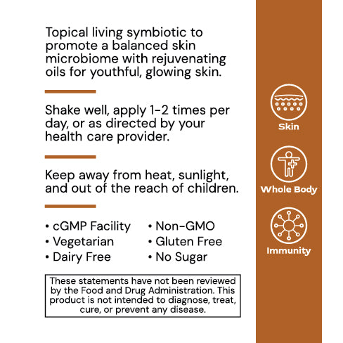 Topical living synbiotic to promote a balanced skin microbiome with rejuvenating oils for youthful, glowing skin.