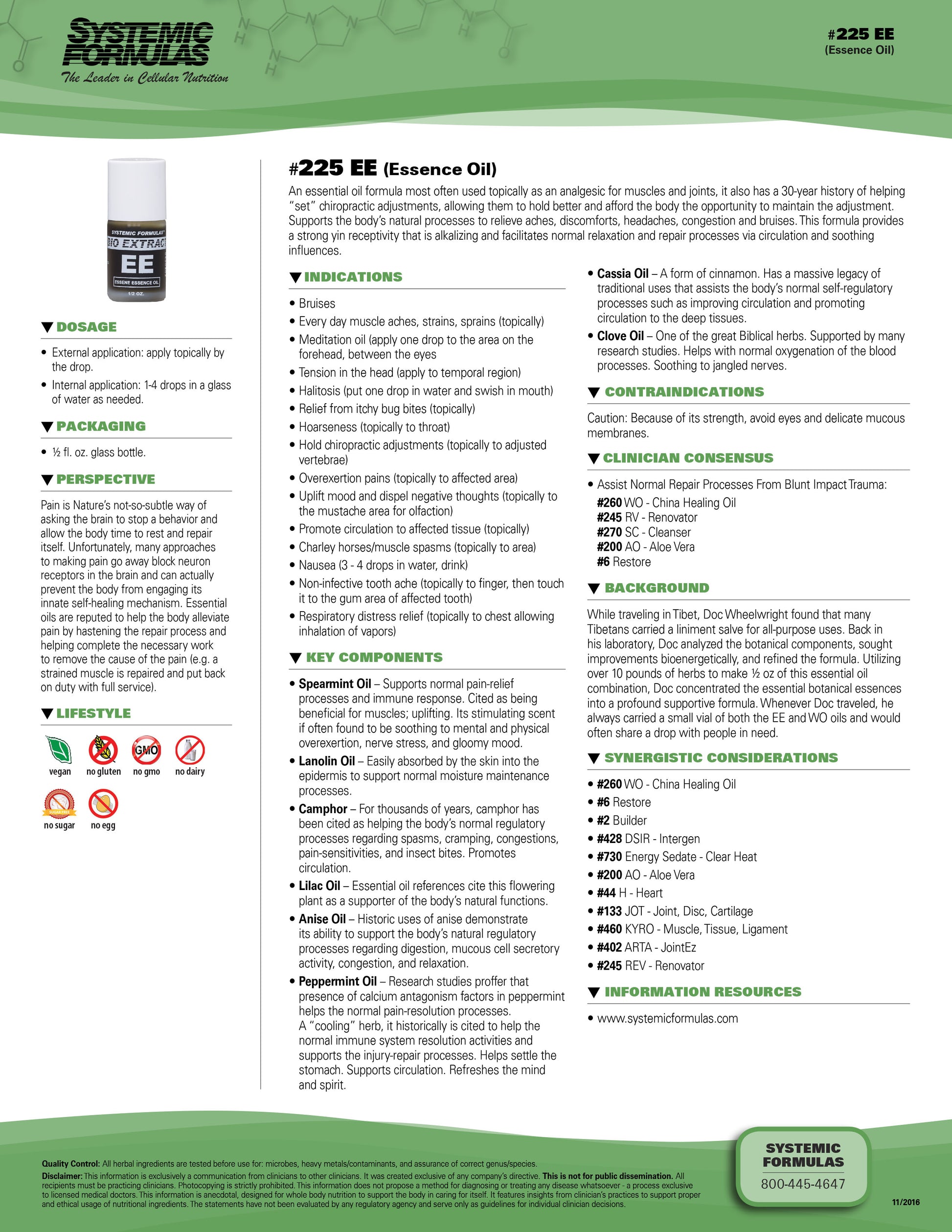 An essential oil formula most often used topically as an analgesic for muscles and joints, it also helps “set” chiropractic adjustments, allowing them to hold better and afford the body the opportunity to maintain the adjustment. Supports muscle comfort, and healthy skin color. EE provides a strong yin receptivity that is alkalizing and facilitates relaxation and repair.