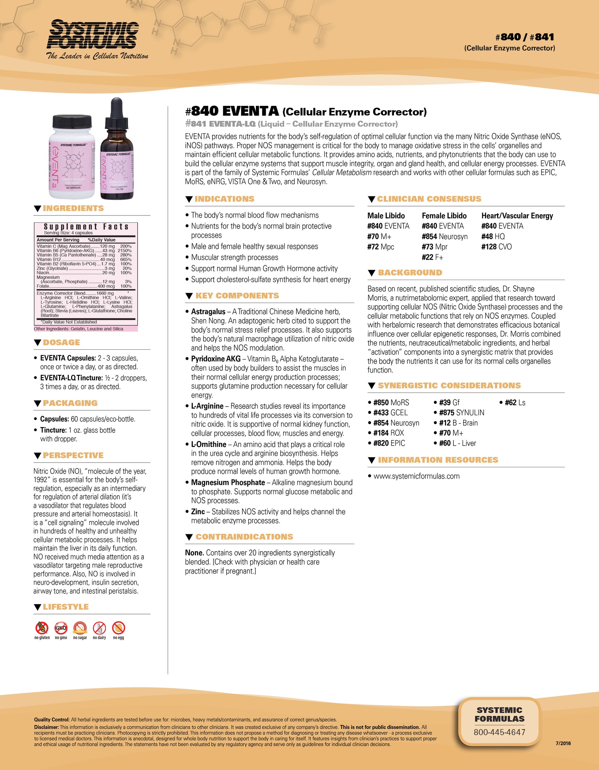 EVENTA supports optimal cellular function of the many Nitric Oxide Synthase (NOS) pathways. Proper NOS management is critical to lowering oxidative stress on the cells’ organelles and maintaining efficient cellular metabolic functions. It provides amino acids, nutrients, and phytonutrients that can help build the cellular enzyme systems that support muscle integrity, organ and gland health, and increased energy. EVENTA is part of the family of Systemic Formulas’ Cellular Healing research. Often used post exercise or in times when optimal nutrient blood flow is critical.