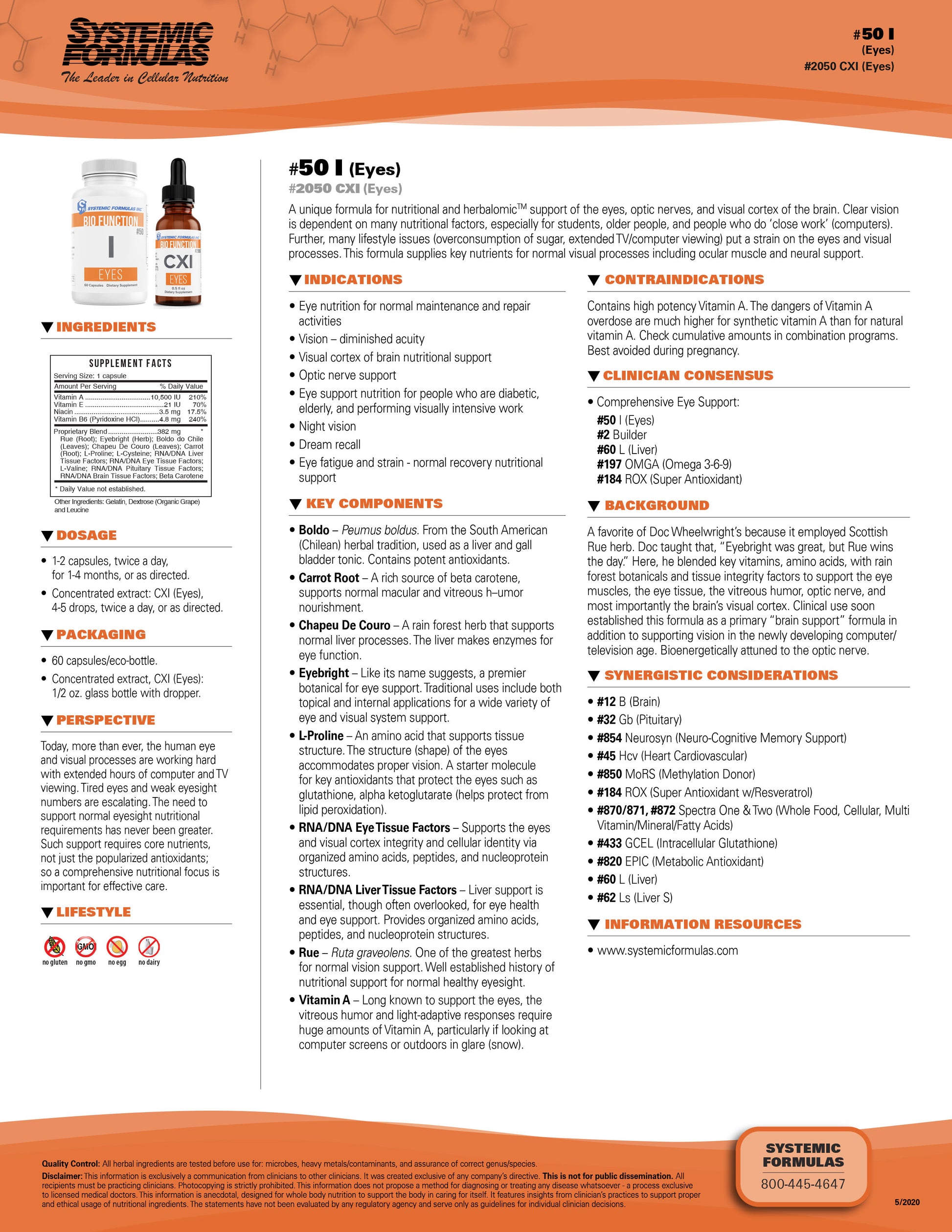 Supports the brain’s optic center (back lobes); supplies nutrients necessary for clear vision. It is designed for students, the elderly (to aid in maintaining eye health during the natural aging process), those who do “close” work (computers), and for those seeking nutrition to maintain an already healthy vision. Formula I (Eyes) ensures the availability of necessary natural vitamin A as well as additional sight factors needed for good vision systems.
