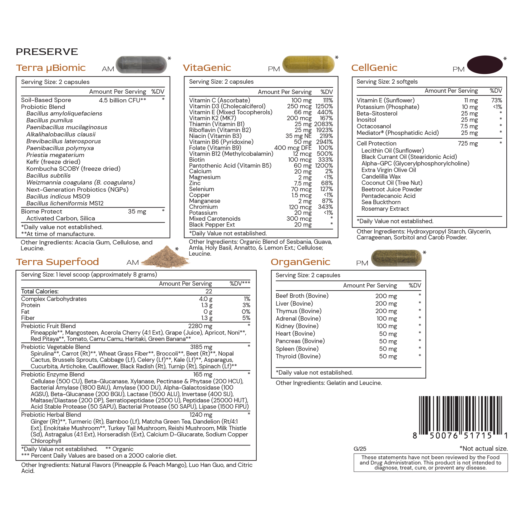 Preserve combines Terra µBiomic, Terra Superfood, CellGenic, VitaGenic, and OrganGenic.