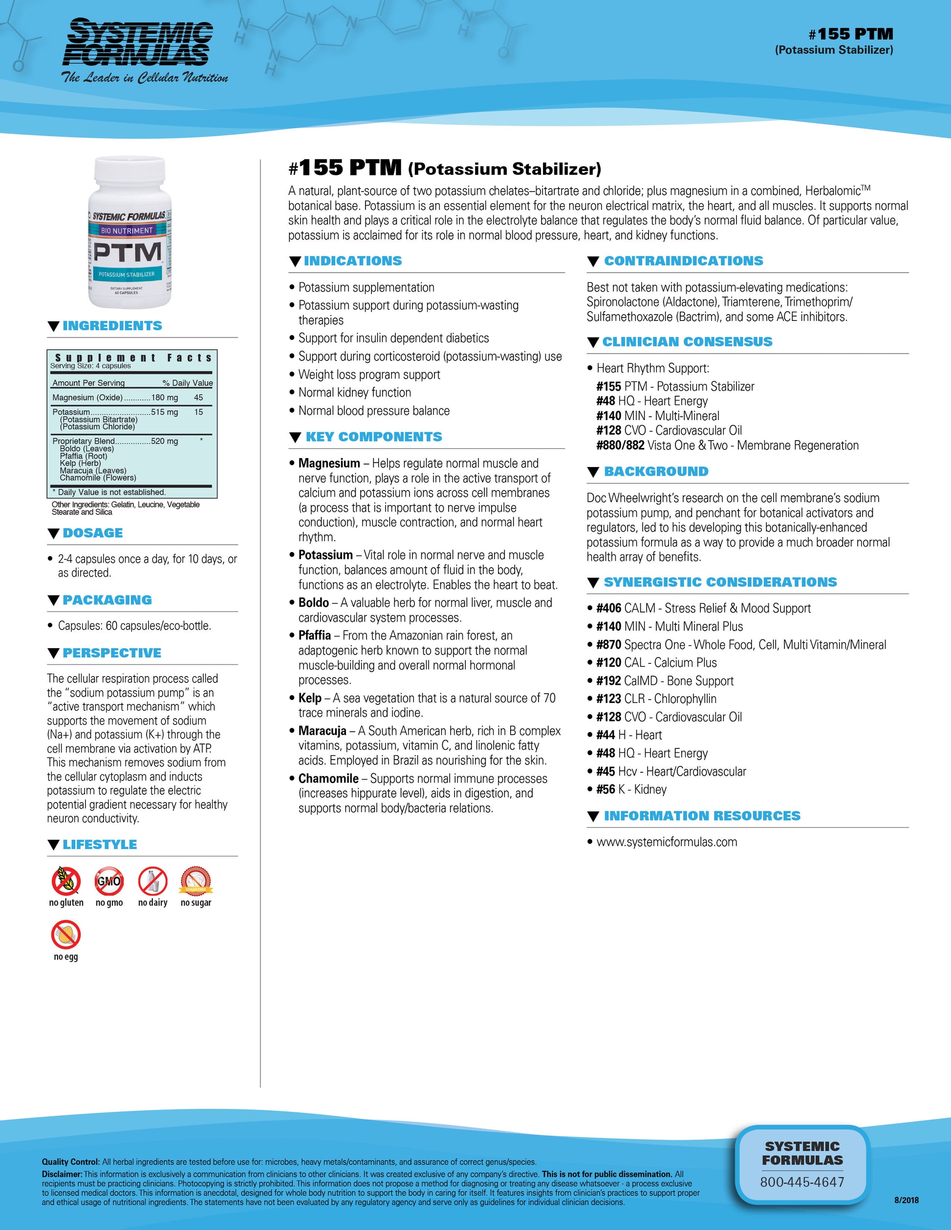 PTM is a natural, plant source of two forms of potassium (bitartrate and chloride). It is designed to provide balanced, maintain healthful blood levels of potassium and magnesium, and intracellular presence, while providing support for muscles, nerves, brain, hair and skin. It provides support for water and sodium electrolyte balance. Provides support for weight loss programs.