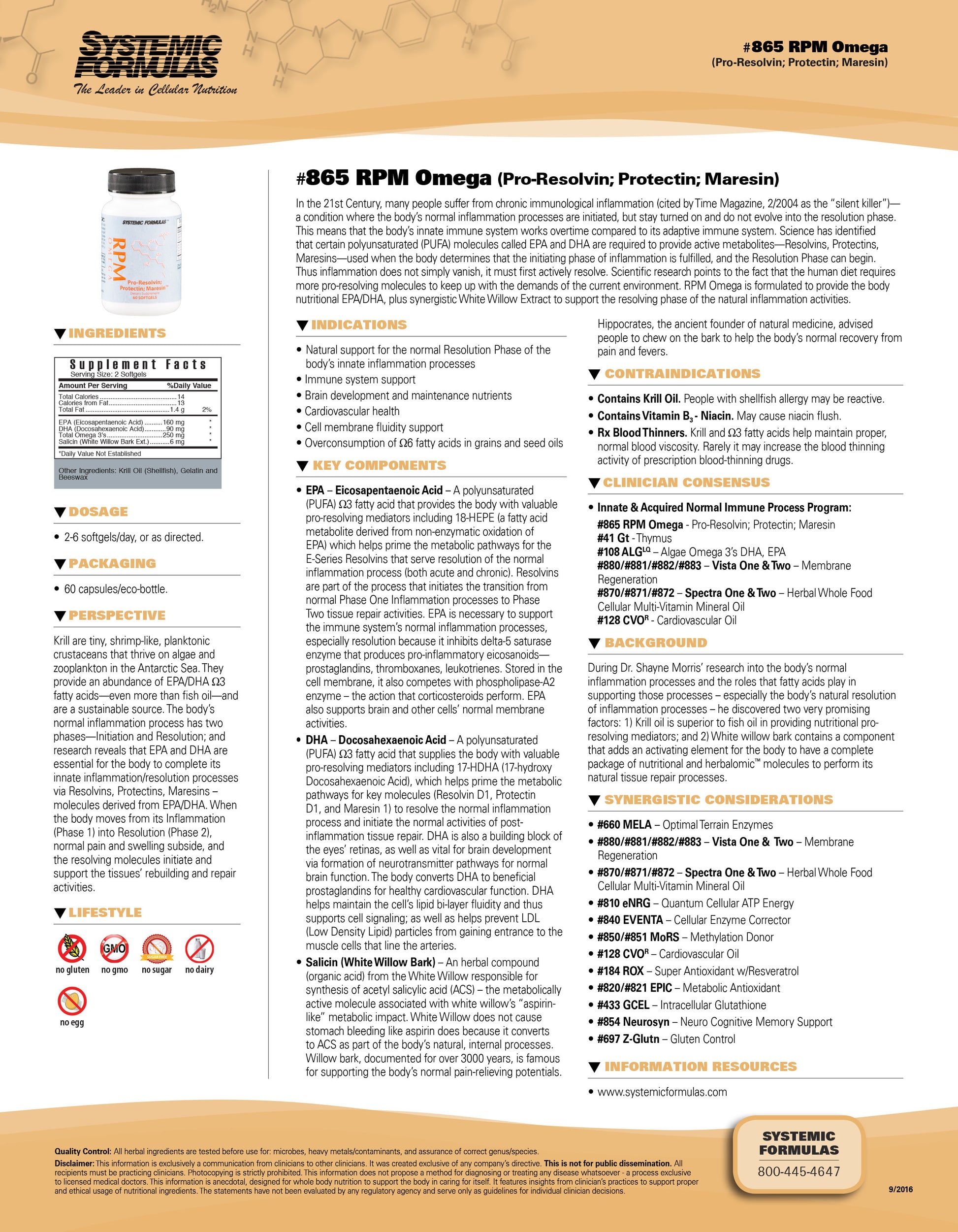 In the 21st Century, many people suffer from chronic immunological inflammation (cited by Time Magazine, 2/2004 as the “silent killer”)— a condition where the body’s normal inflammation processes are initiated, but stay turned on and do not evolve into the resolution phase. This means that the body’s innate immune system works overtime compared to its adaptive immune system. Science has identified that certain polyunsaturated (PUFA) molecules called EPA and DHA are required to provide active metabolites—Resolvins, Protectins, Maresins—used when the body determines that the initiating phase of inflammation is fulfilled, and the Resolution Phase can begin. Thus inflammation does not simply vanish, it must first actively resolve. Scientific research points to the fact that the human diet requires more pro-resolving molecules to keep up with the demands of the current environment. RPM Omega is formulated to provide the body nutritional EPA/DHA, plus synergistic White Willow Extract to support the resolving phase of the natural inflammation activities