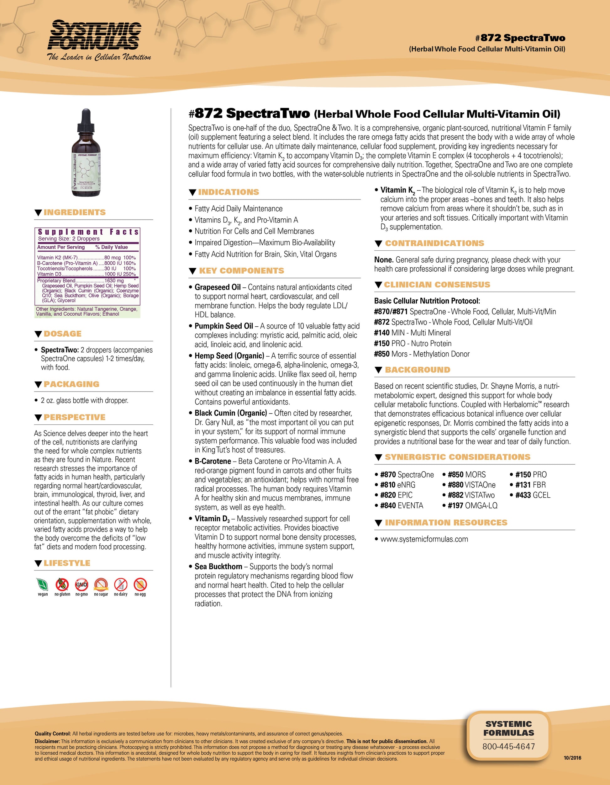 SpectraTwo is one-half of the duo, SpectraOne-SpectraTwo, and is a very comprehensive, plant-sourced, nutritional oil supplement due to the select blend and inclusion of rare Omega fatty acids that present the body with a wide array of fatty acids for cellular, molecular use. A daily maintenance, cellular food supplement. SpectraOne and SpectraTwo are actually one complete cellular food formula in two formulas with the water soluble nutrients in SpectraOne and the oil-soluble nutrients in SpectraTwo.